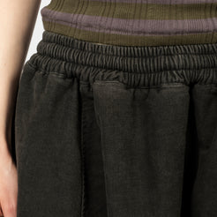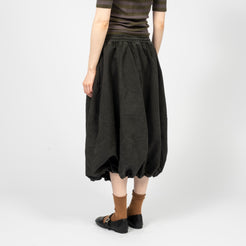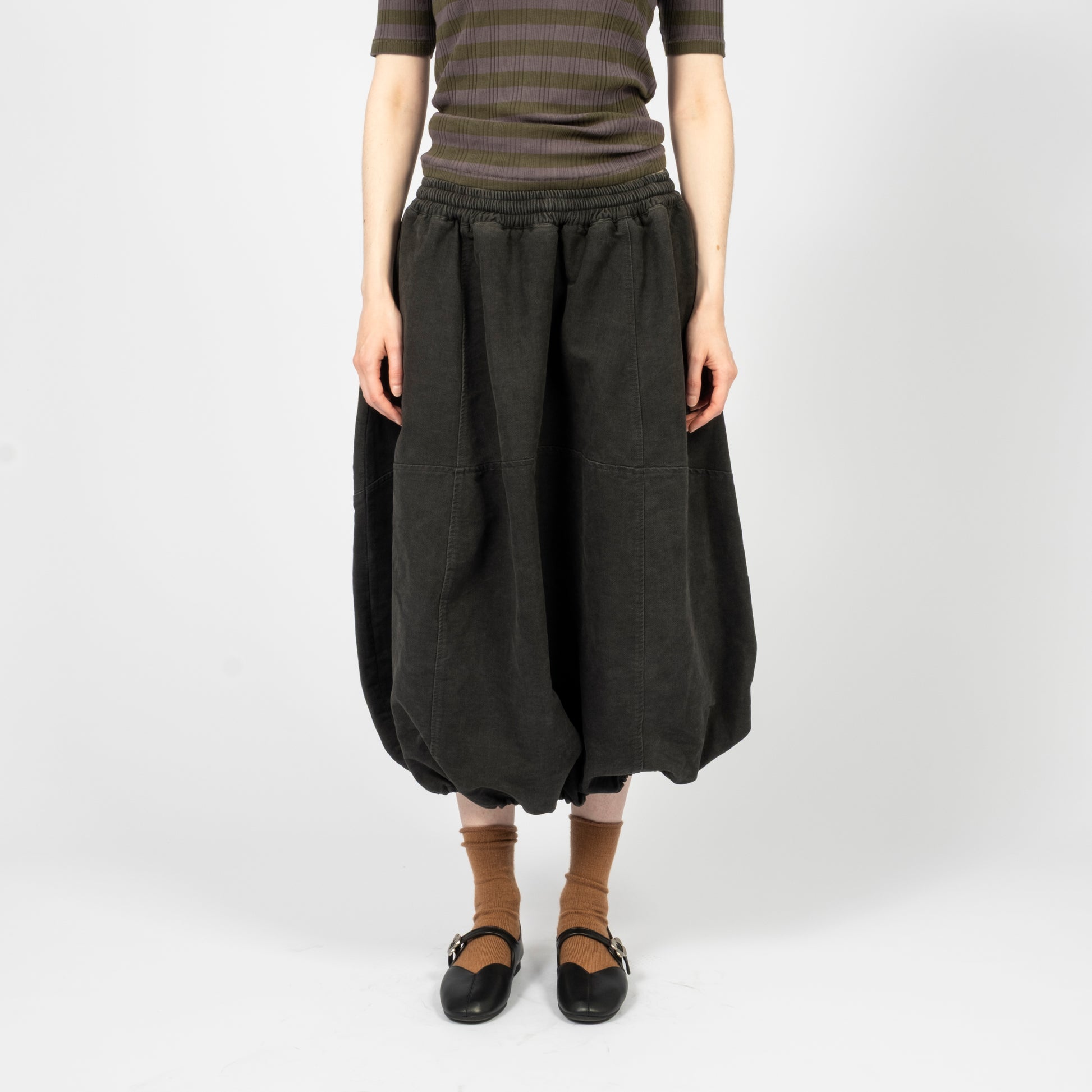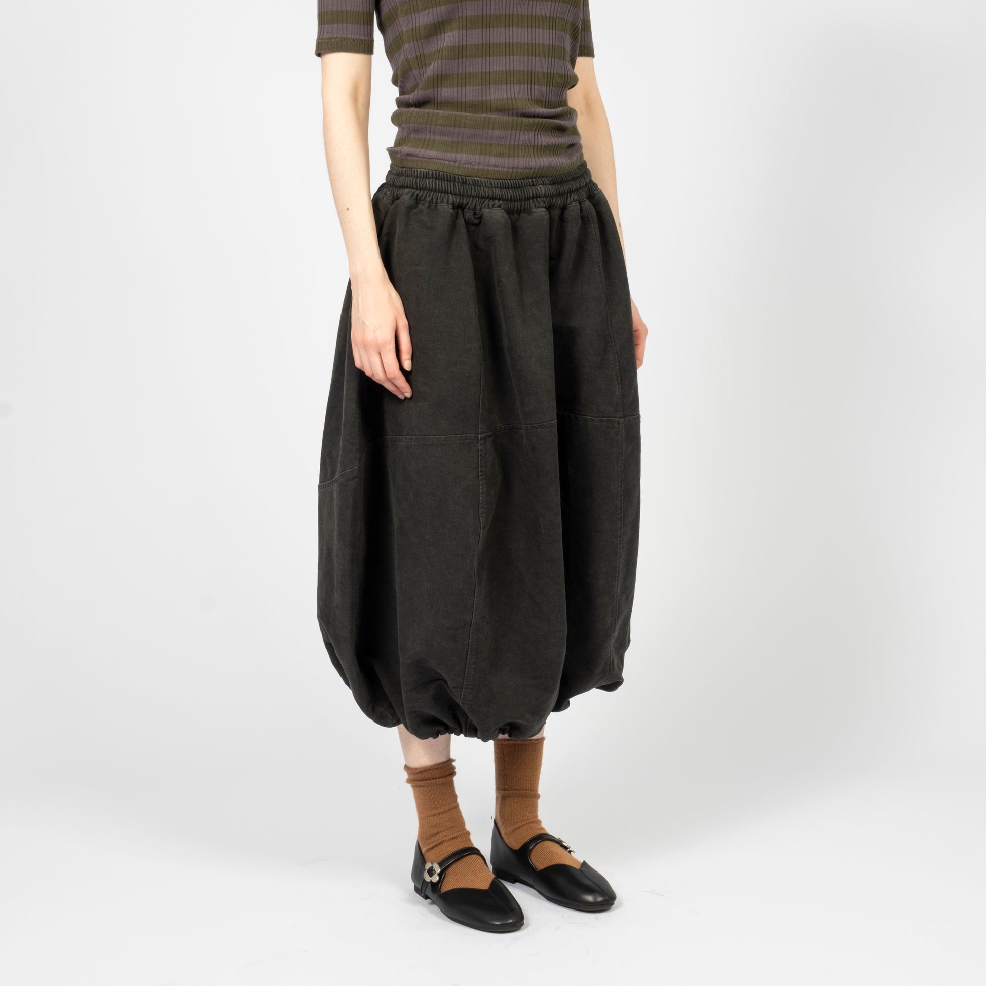 Balloon-shaped skirt crafted from cotton Délavé fabric with a subtle shower-repellent finish. Designed with an elasticated waist and internal cord, adjustable hem drawcords, and practical side seam pockets. Each piece features unique shade variations from the Délavé dye process.