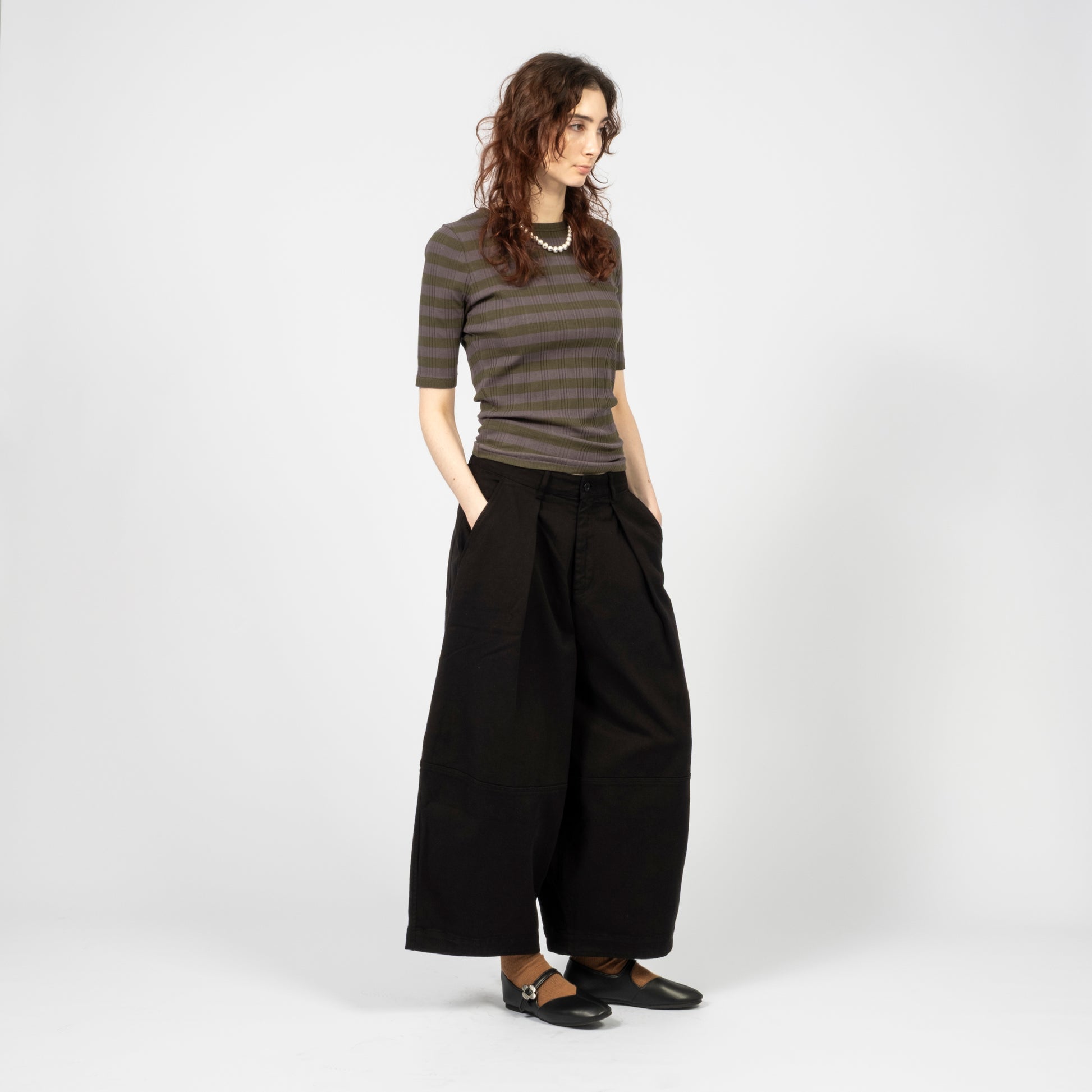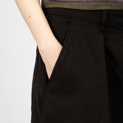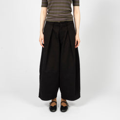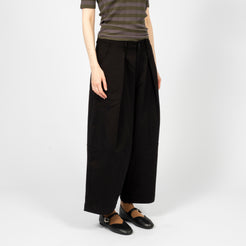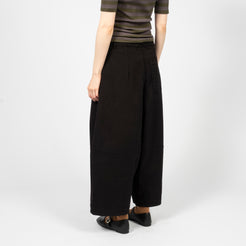 High-waisted wide-leg trousers crafted from a Portuguese wool blend suiting fabric. Designed with front pleats and a deep hem for refined volume, finished with corozo button fastening and a YKK zip fly.