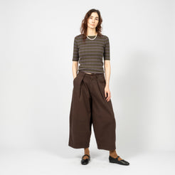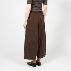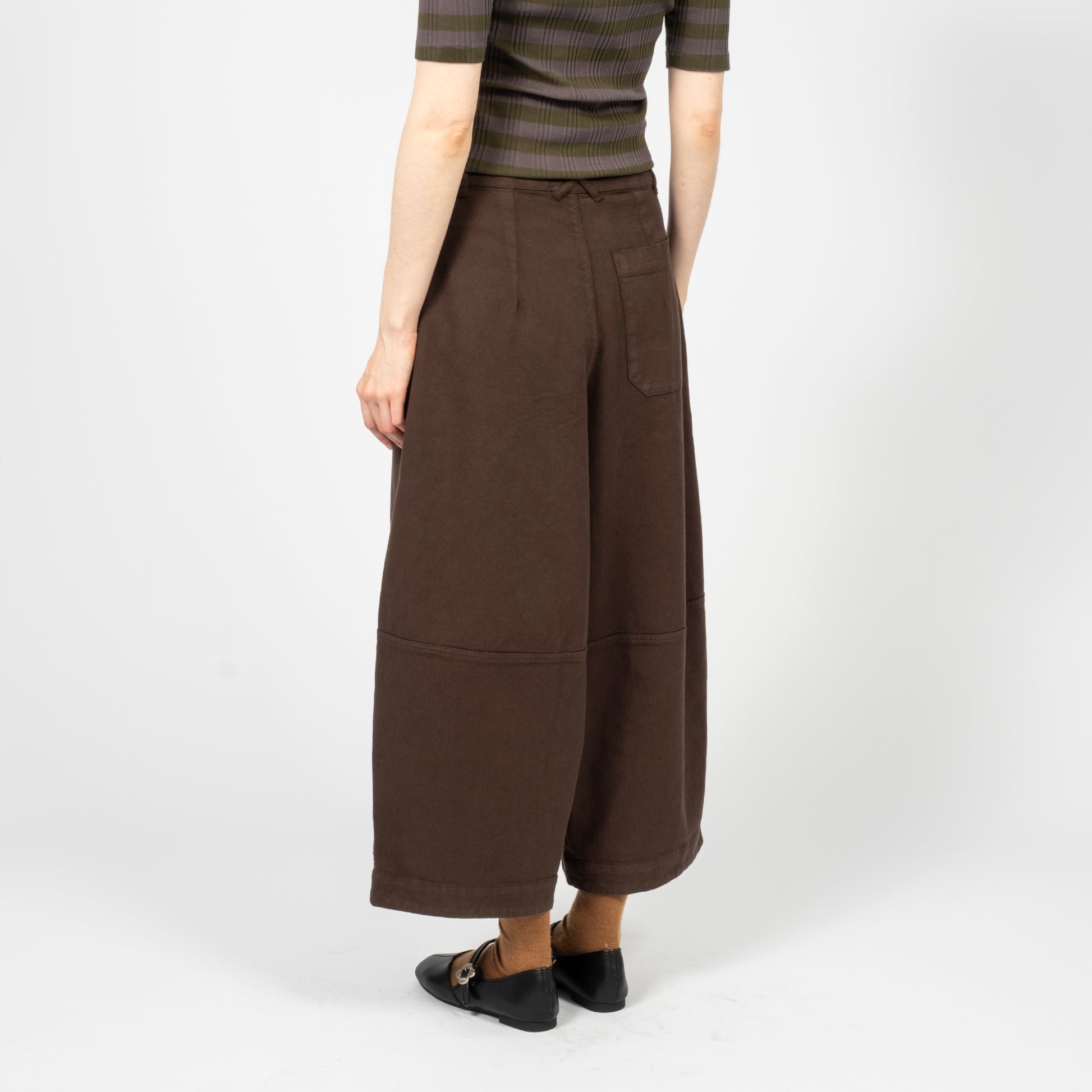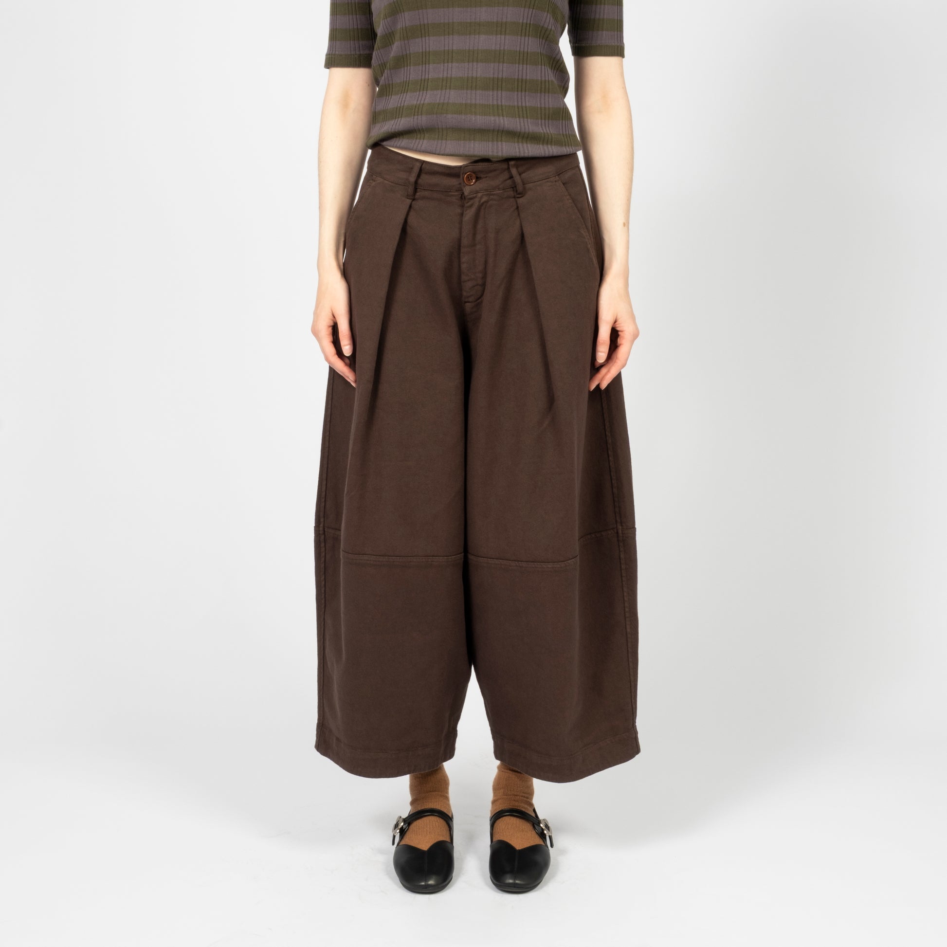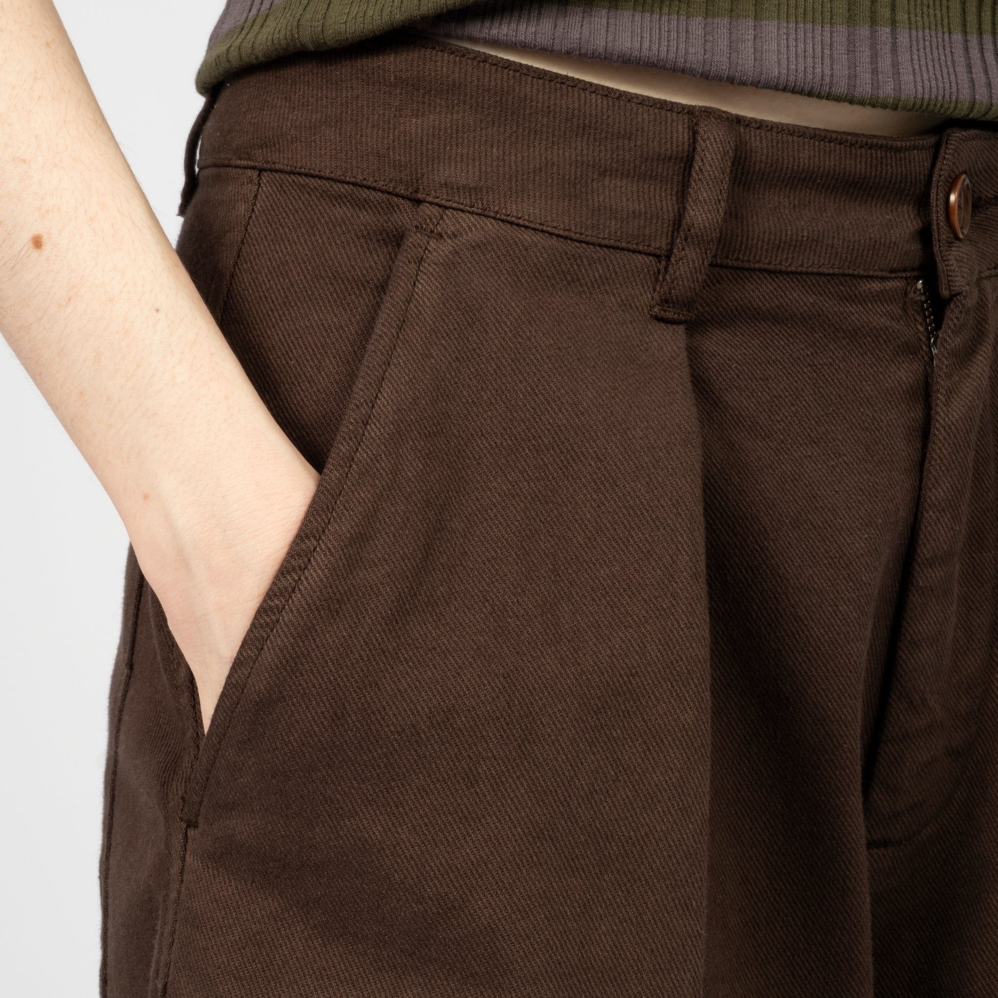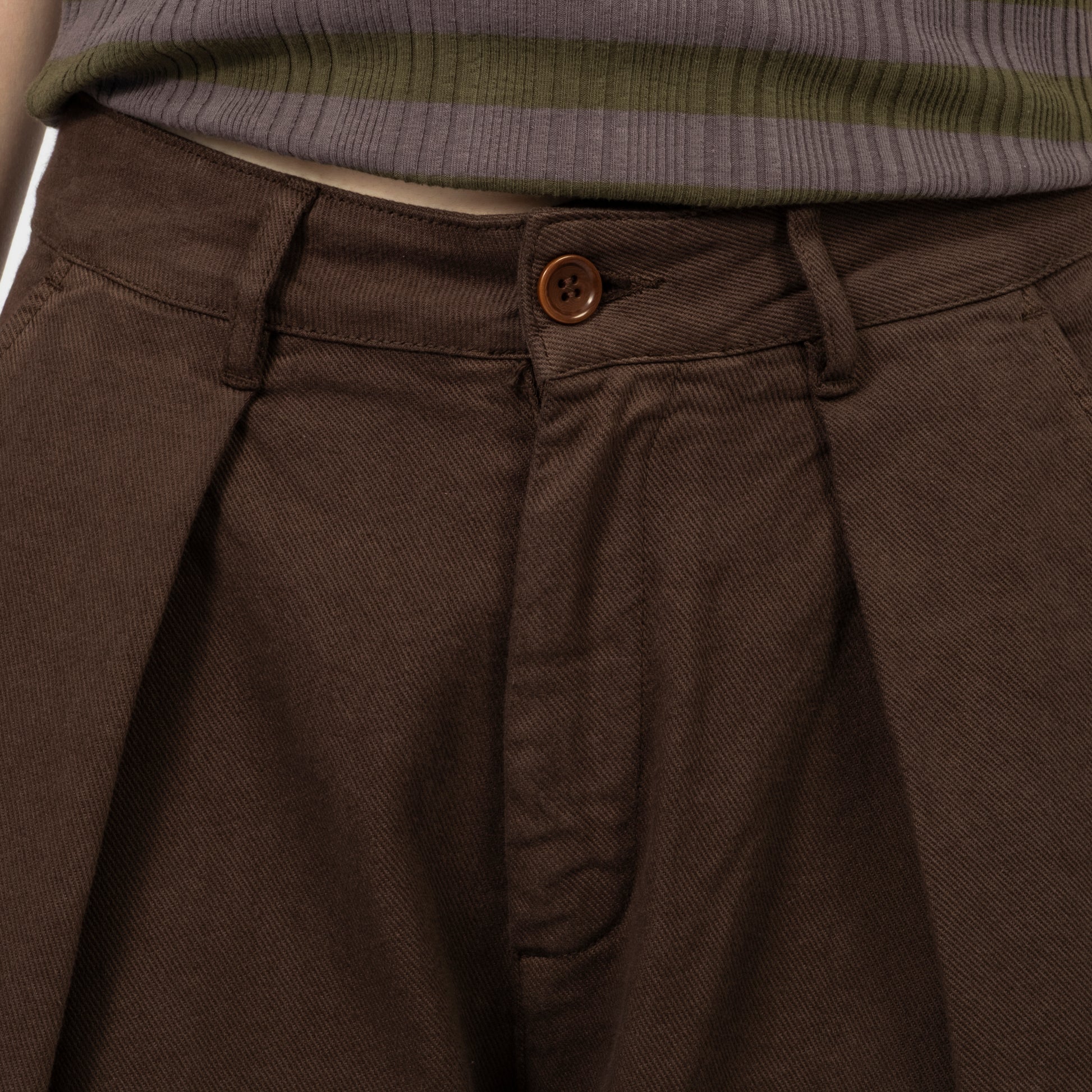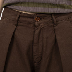 High-waisted wide-leg trousers crafted from a Portuguese wool blend suiting fabric. Designed with front pleats and a deep hem for refined volume, finished with corozo button fastening and a YKK zip fly.