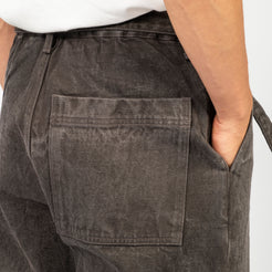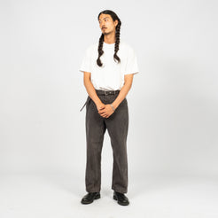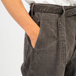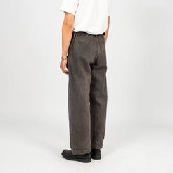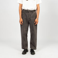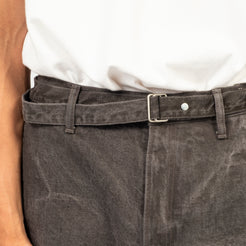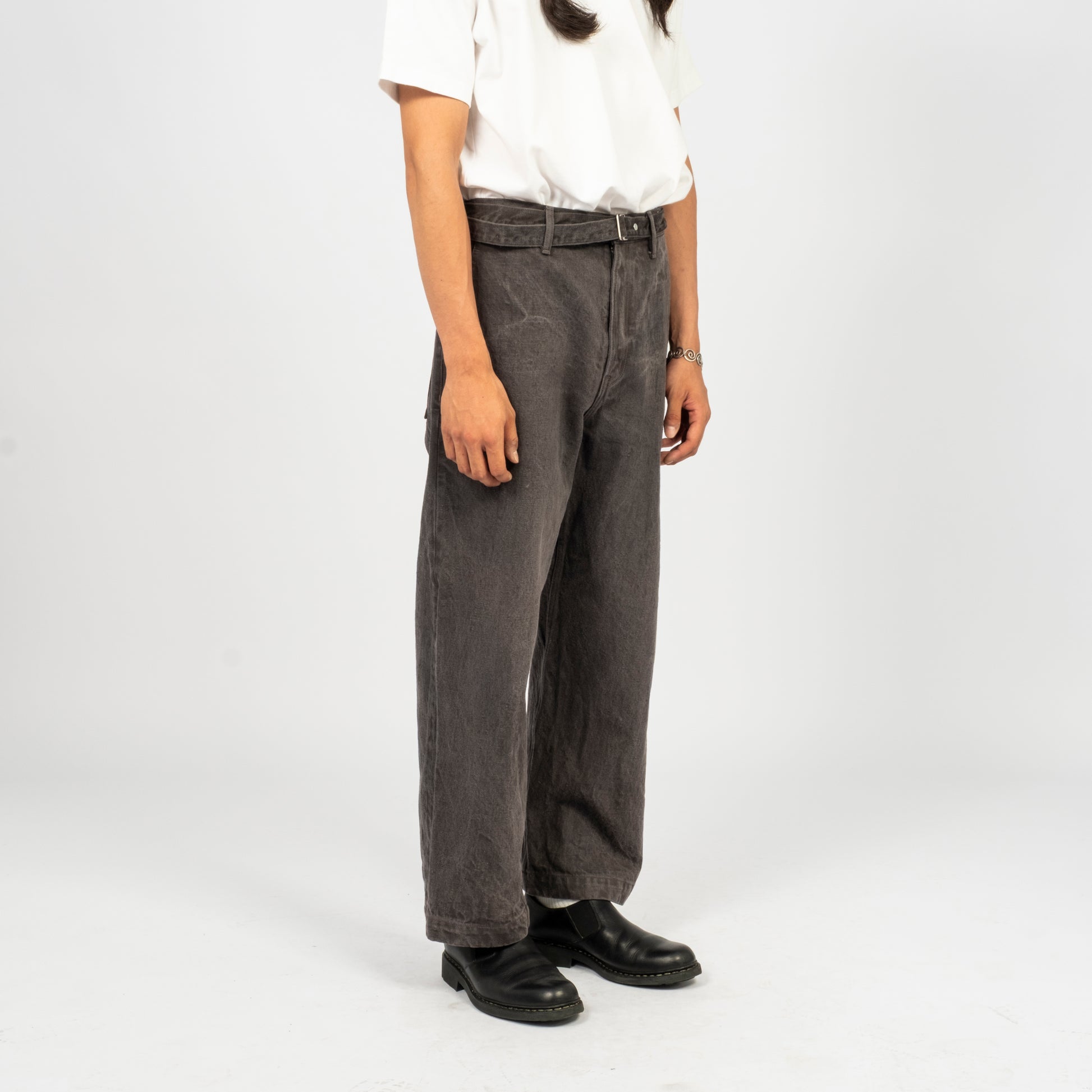 A work trouser with an elasticated back waist and a long matching belt, cut in a relaxed wide straight silhouette. Made from loom-state selvedge denim woven slowly on old shuttle looms in Okayama, with unpainted iron hardware that ages naturally over time.