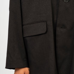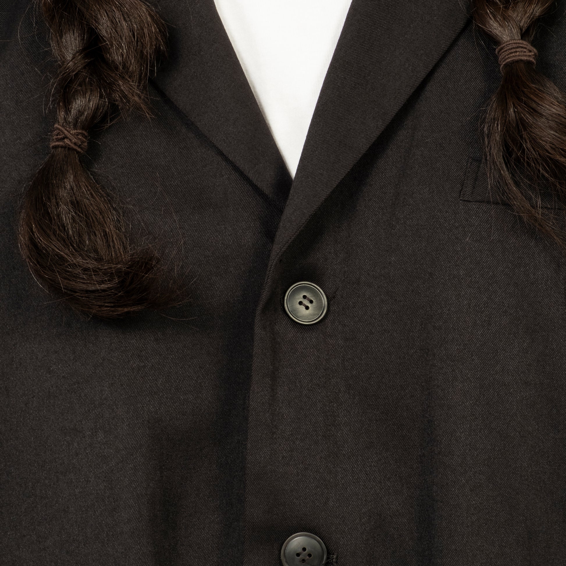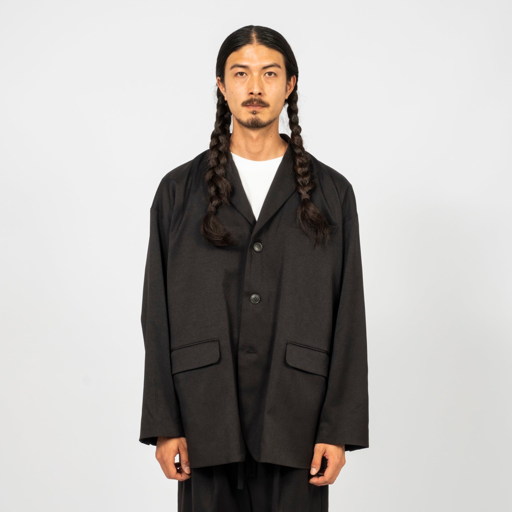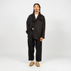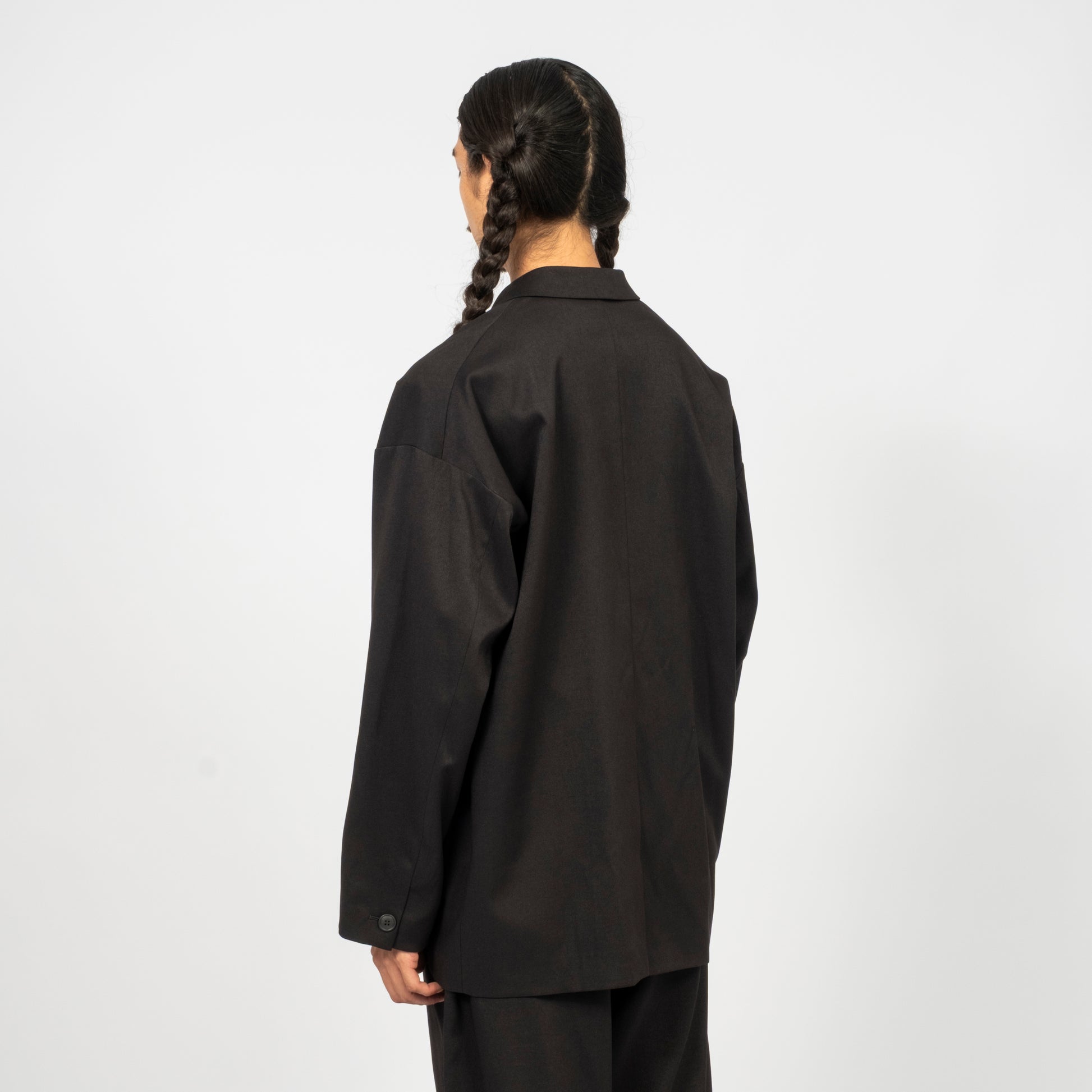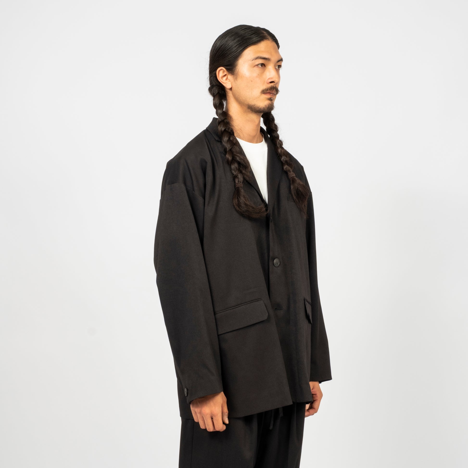 A relaxed drop-shoulder tailored jacket with a classic three-button look and an easy, cardigan-like wearability. Soft, lightweight, and drapey, it brings tailoring into an everyday, effortless silhouette. Made from an original recycled-poly gabardine woven in Hokuriku, with the warmth and elegance of wool and the practicality of modern performance fabric.