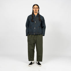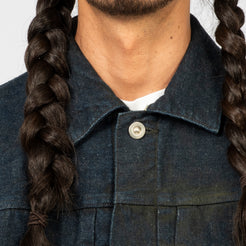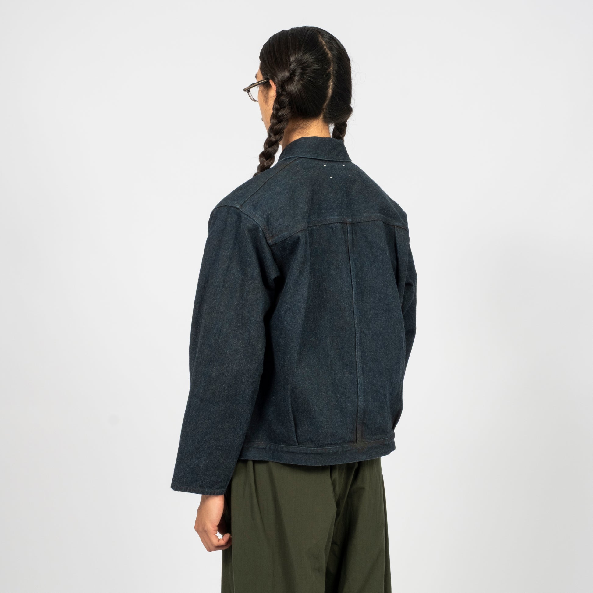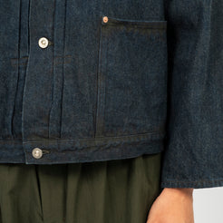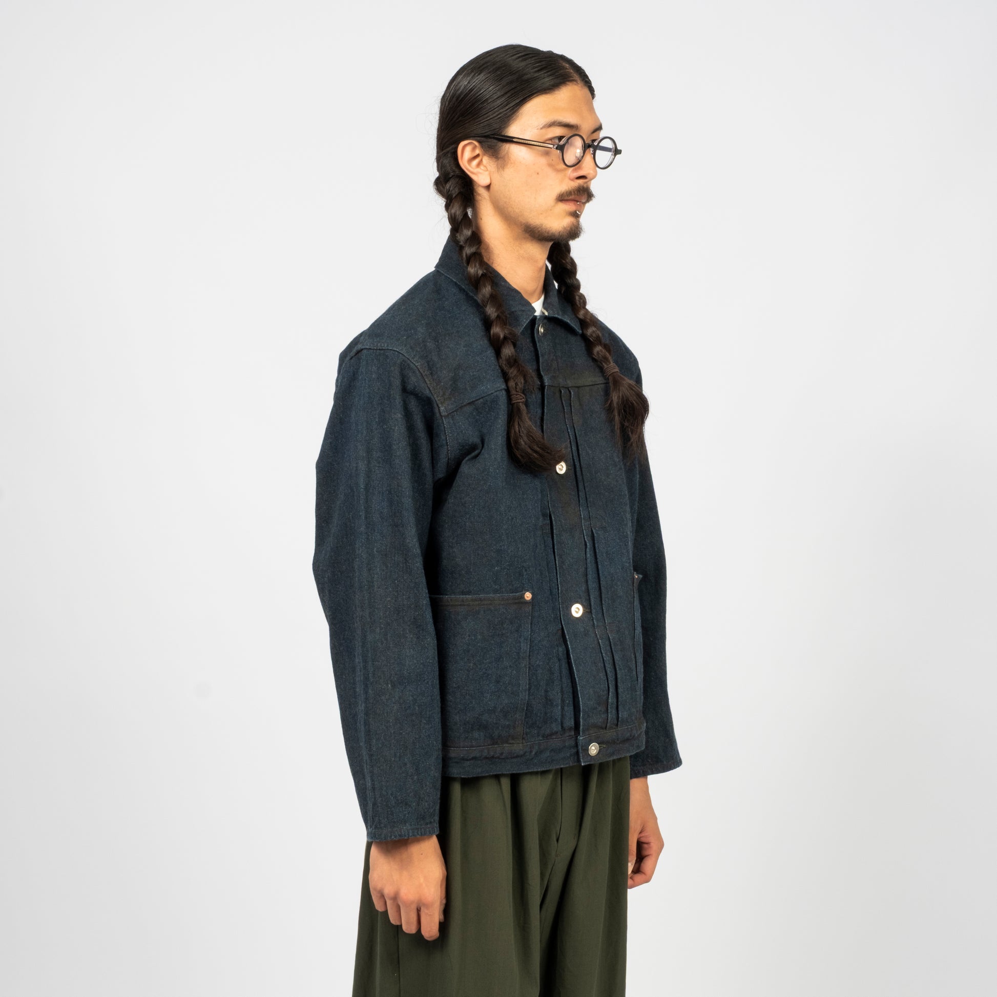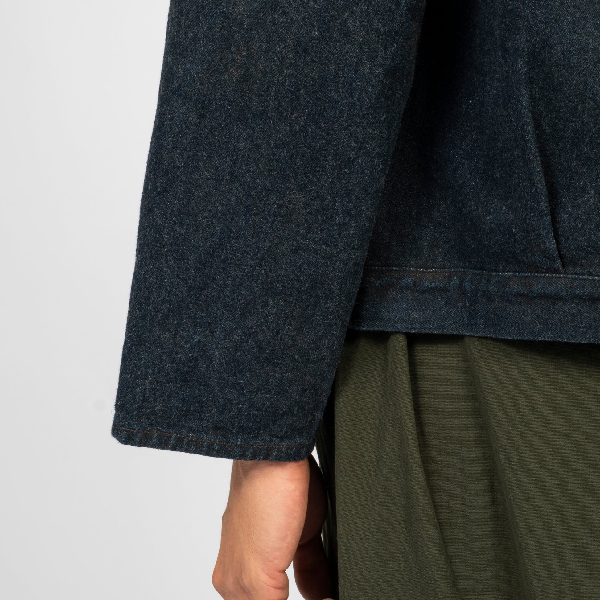 A pleated blouse inspired by the simple house-brand pieces of an earlier era, designed with denim-jacket details and oversized coverall pockets. Crafted from high-density selvedge denim woven on old shuttle looms in pursuit of heritage XX character, and garment-dyed by hand in a historic Kyoto dye house for a finish that ages beautifully with wear.
